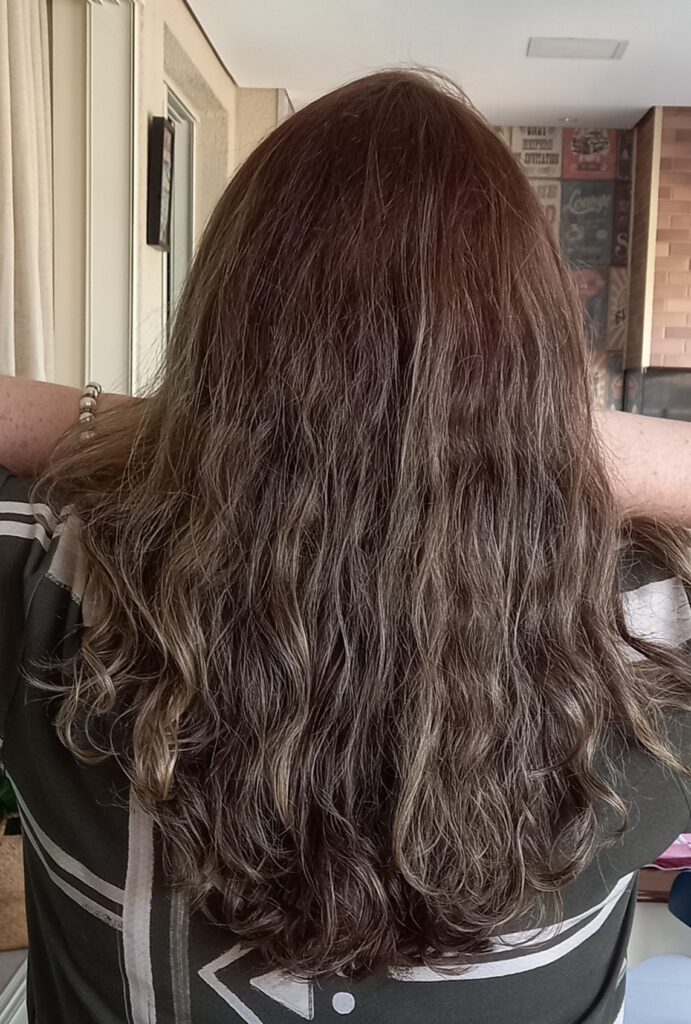 No meu tipo de cabelo, que não é tão volumoso, 2 pumps do produto são suficientes para finalizá-lo. Aqui o menos é mais! Se usar muito produto, o cabelo irá ficar duro e sem movimento. Não é necessário enluvar mecha a mecha como vemos as mulheres cacheadas fazendo. O cabelo ondulado requer menos produto para ter movimento.
